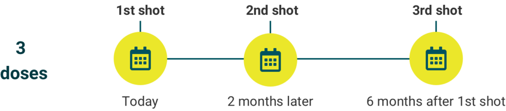 The minimum interval between the first and second doses is 4 weeks; between the second and third doses, 12 weeks; and between the first and third doses, 5 months.