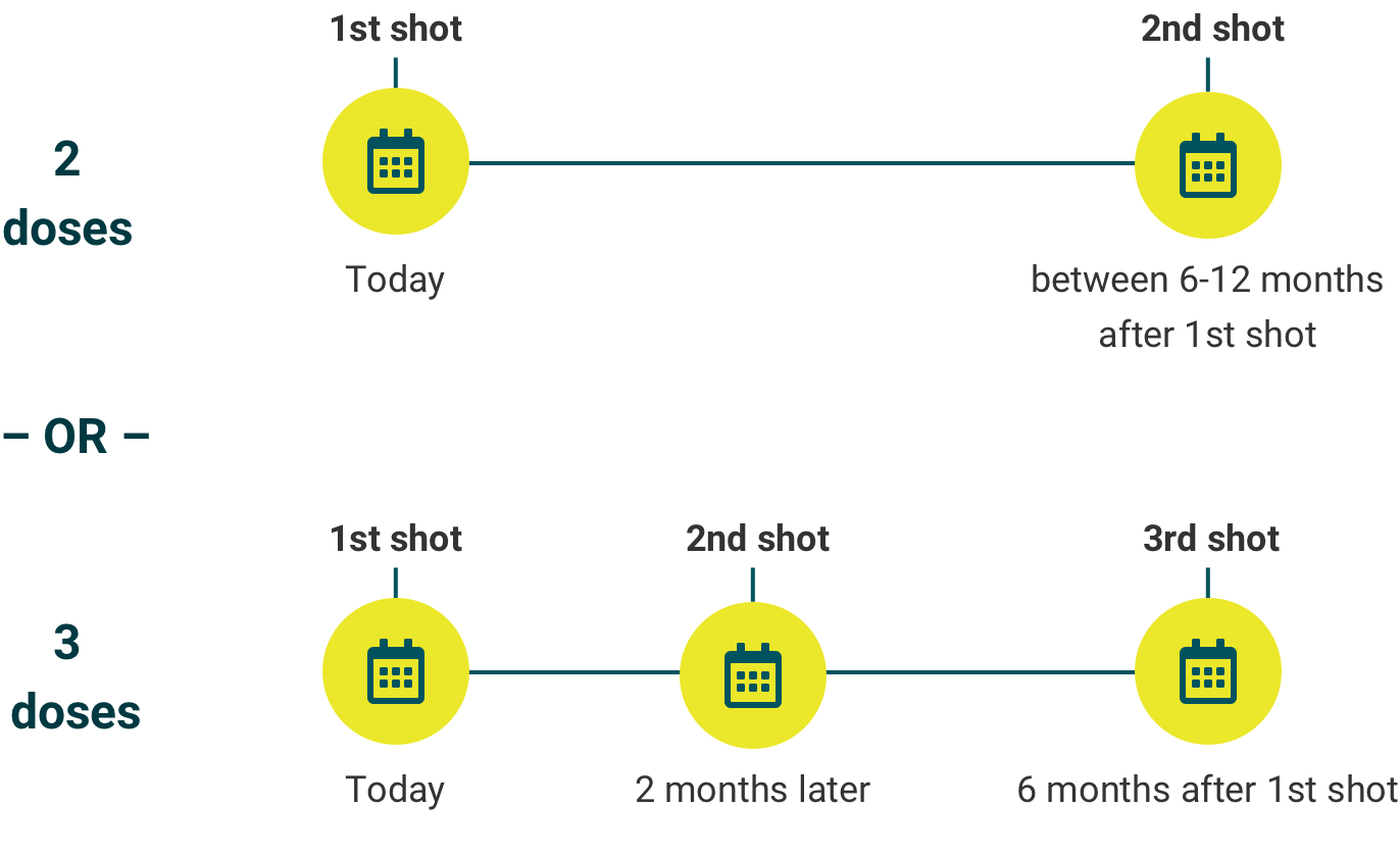 The minimum interval between the first and second doses is 5 months. The second dose may be administered 6 to 12 months after the first dose. If the second dose is given less than 5 months after the first, a third dose is required.
